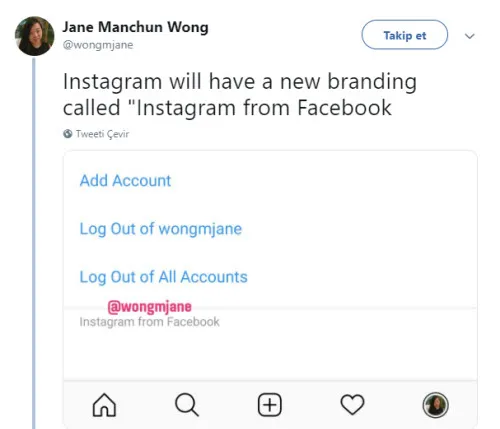 Tersine mühendislik yapan Jane Manchun Wong, "Instagram, Instagram From Facebook denen yeni bir marka ismine sahip olacak." derken bir de yenilenmiş markaya dair ekran resmi paylaştı.